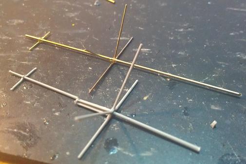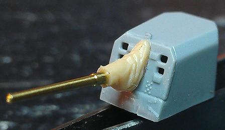 12/01/2013 I've finished the forward Conning tower so now I'm going to rig the flag halyards and antenna cables This is Substantially easier to do at this stage. There's a fife rail between the the ship's cranes on the original ship for tieing off the halyards, it's not in the kit so I added a bar made fron .015 brass rod to tie on to. once I have the rigging completed I'll cover and dress it up with some strip styrene