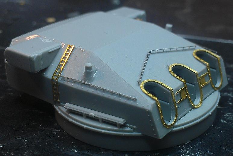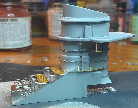 | 11/25/2013. I've been building and painting the sub assemblies for the conning tower and most of the larger sub asseblies of the forward superstructure and conning tower have been assembled, masked off and painted. Now it's time to add small details such as railings, platforms and ladders. These are being hand painted since it would be impossible to mask off the ship with them attached
