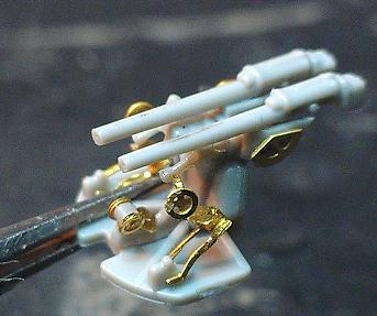 Railings on the AA Deck... What a nightmare. I had great difficulty getting them to adhere to the deck. I assume it's due to the diamond plate details on the deck. Definately recommend prebending these before adding anything to the deck. Finally succeeded but will need to retouch the paint where all the excess CA I couldn't remove. Next comes the ship's boats... Lots of small parts here. Wood decks are a geat touch. |