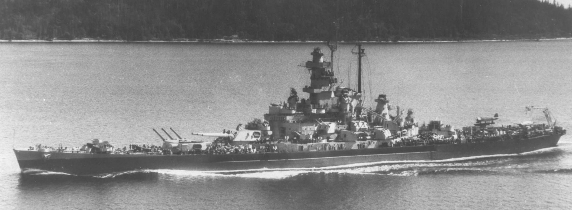 During January 1945, she sailed as part of TF 38, which struck Formosa and supported the landing at Lingayen Gulf. During that time she turned into the South China Sea, where TF 38 destroyed shipping from Saigon to Hong Kong; the operation concluded with air strikes on Formosa and Okinawa From 10 February to 3 March, with the 5th Fleet, Massachusetts guarded carriers during raids on Honshu. Her group also struck Iwo Jima by air for the invasion of that island. On 17 March, the carriers launched strikes against Kyushu while Massachusetts fired in repelling enemy attacks, splashing several planes. Seven days later she bombarded Okinawa. She spent most of April fighting off air attacks, while engaged in the operations at Okinawa, returning to the area in June, when she passed through the eye of a typhoon with 100-knot winds 5 June. She bombarded Minami Daito Jima in the Ryukyus 10 June. Massachusetts sailed 1 July from Leyte Gulf to join the 3d Fleet’s final offensive against Japan. After guarding carriers launching strikes against Tokyo, she shelled Kamaishi, Honshu, 14 July, thus hitting Japan’s second largest iron and steel center. Two weeks later she bombarded the industrial complex at Hamamatsu, returning to blast Kamaishi 9 August. It was here that Massachusetts fired what was probably the last 16-inch shell fired in combat in World War II.